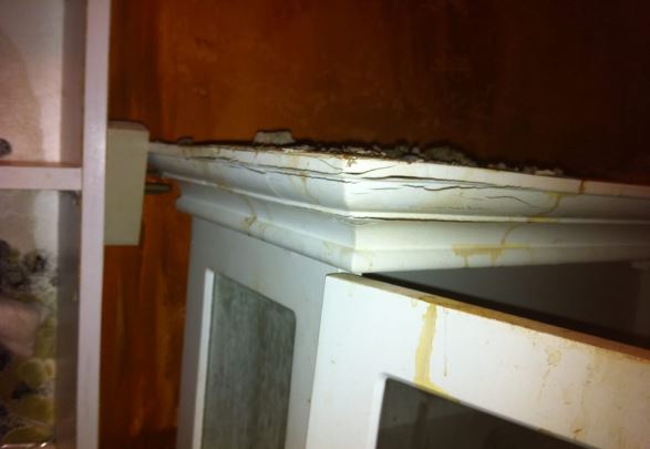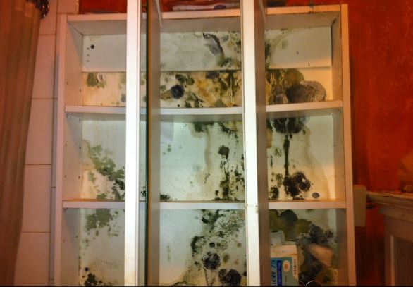 Mold and mildew riddled medicine cabinet due to the leak
