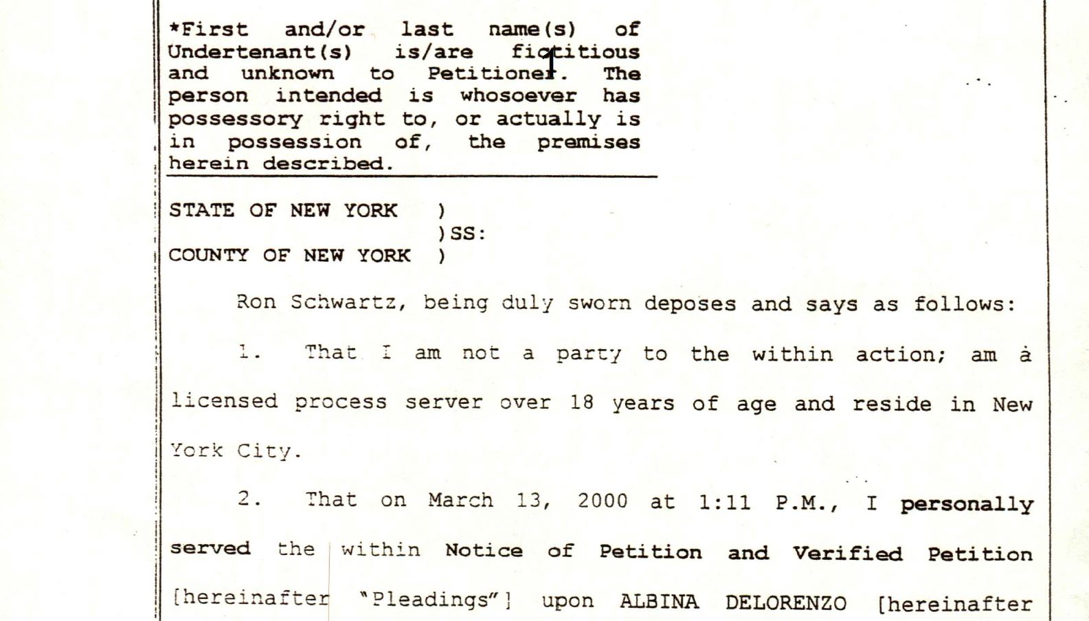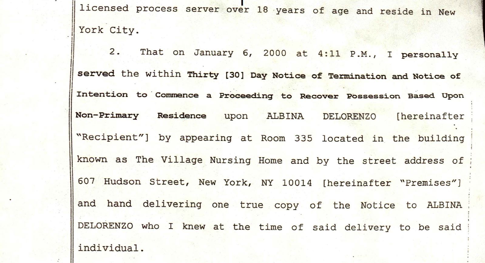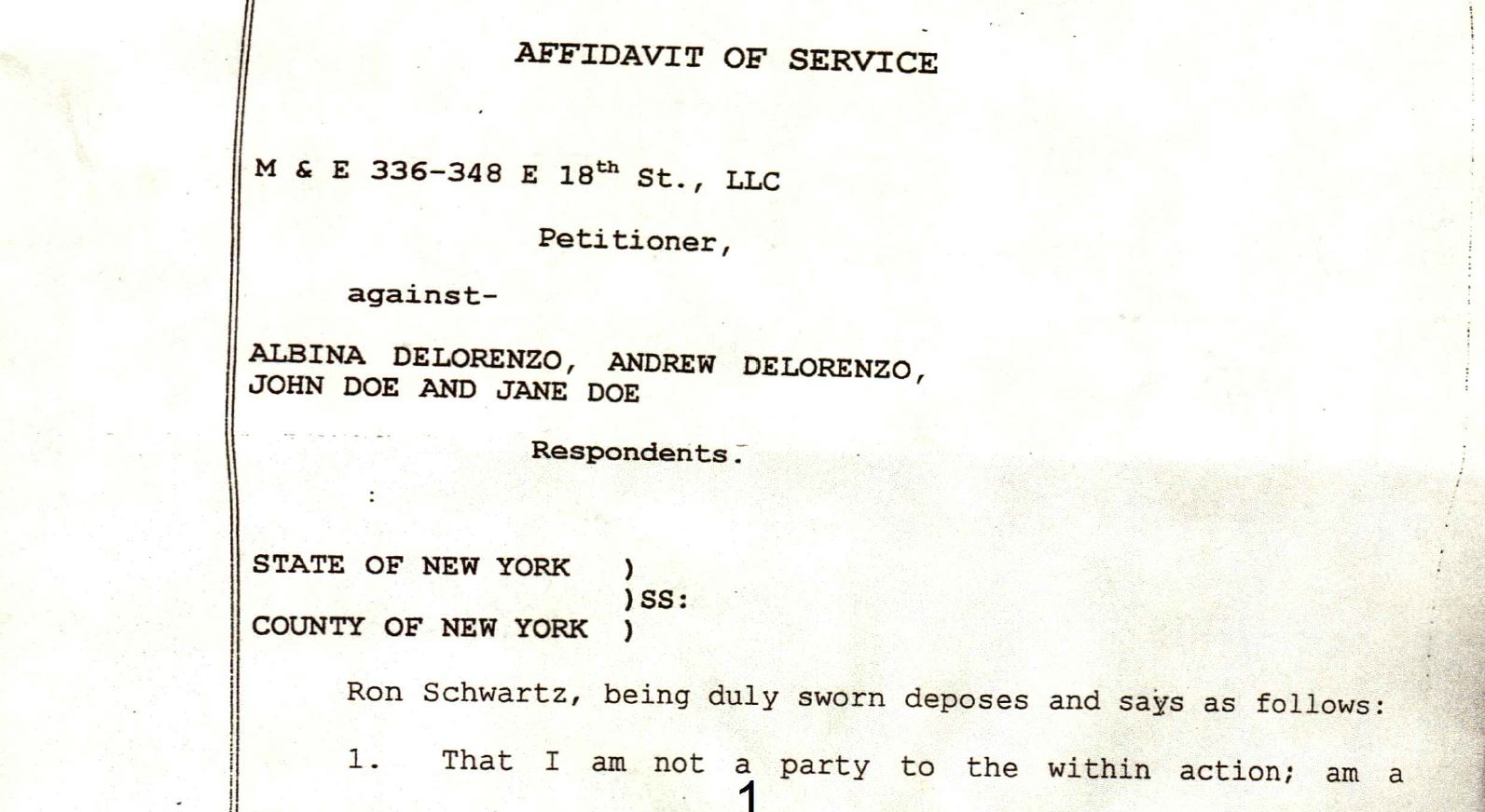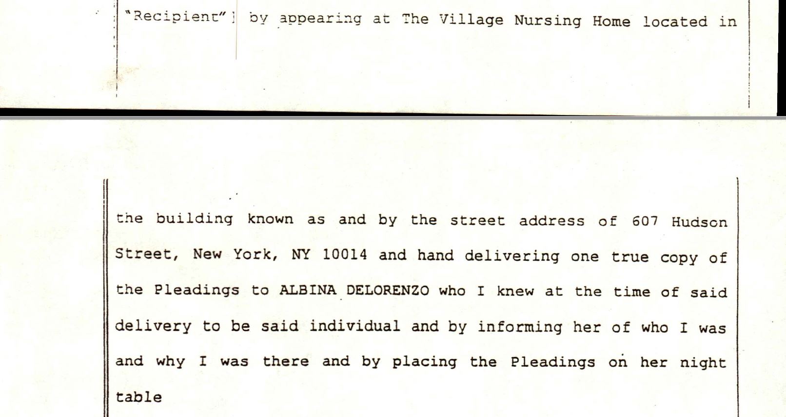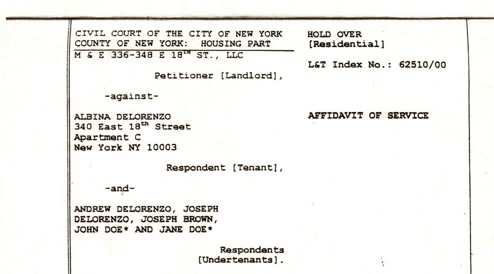 Also of East 18th Street, Albina DeLorenzo, an 84 year old widow, had lived with her two sons since 1965 at 340 East 18th St. and had recently entered Village Care Nursing Home. With one son terminally ill with cancer, her sons were being served eviction papers taped to the doors, sent by mail, and by process servers banging at their door, despite the fact that both sons were fully entitled to succession rights under the law. Croman’s lawyers had court papers served threatening eviction to Albina at the nursing home while she was lying sick in bed and worried about her youngest son with cancer being evicted from her apartment. Steve Croman purchased Albina's building on May 28, 1999, and within six months he began eviction proceedings. In contrast to the previous case of Louisa Cardigan, the DeLorenzo’s were successful because they had a lawyer, but it cost them thousands of dollars in legal fees.