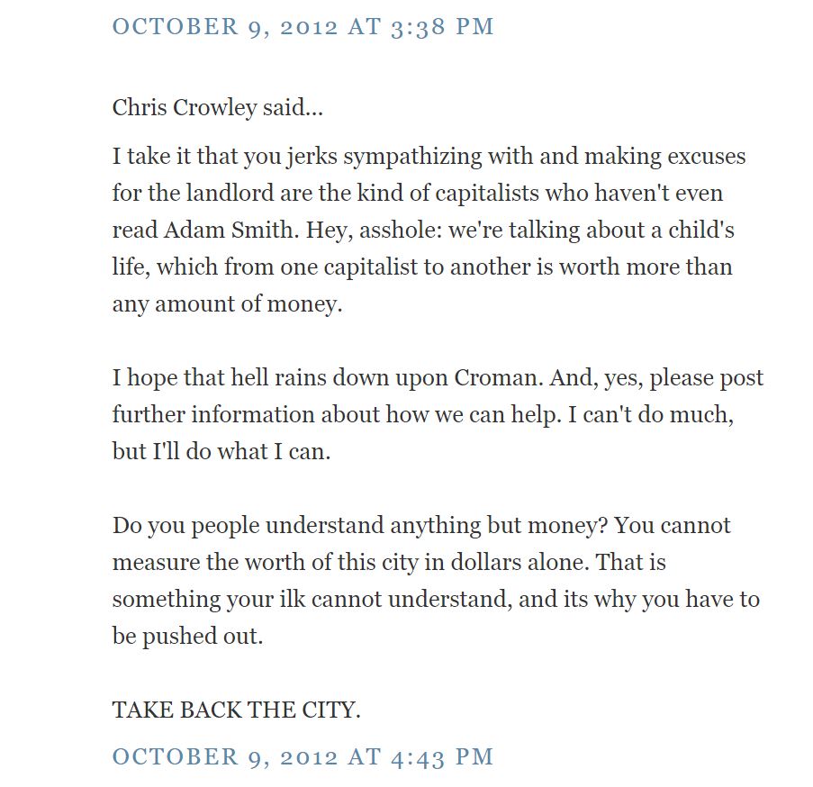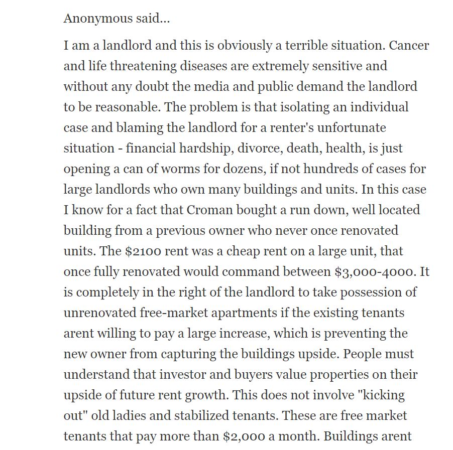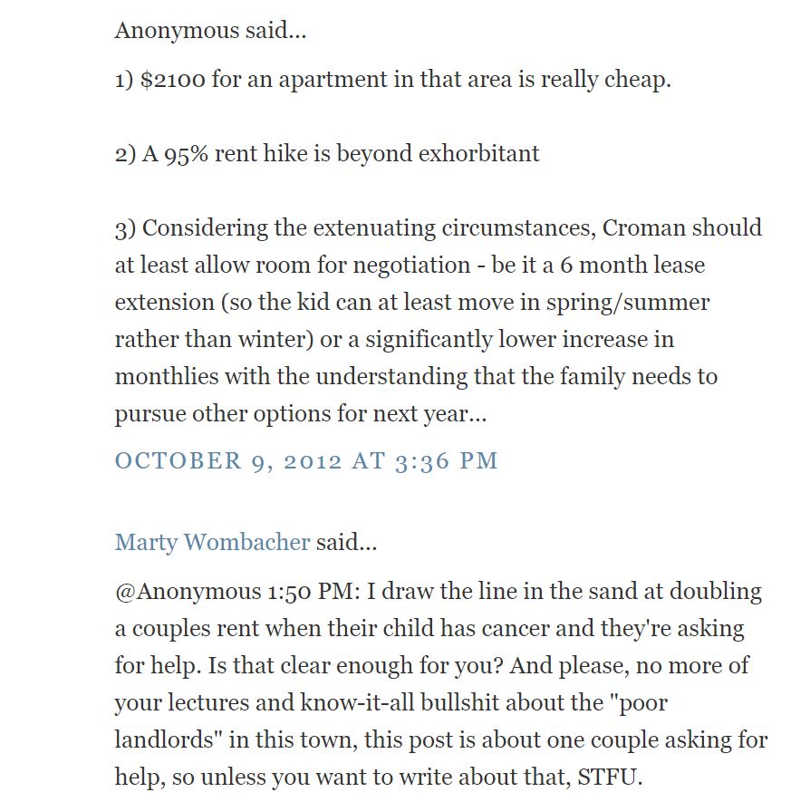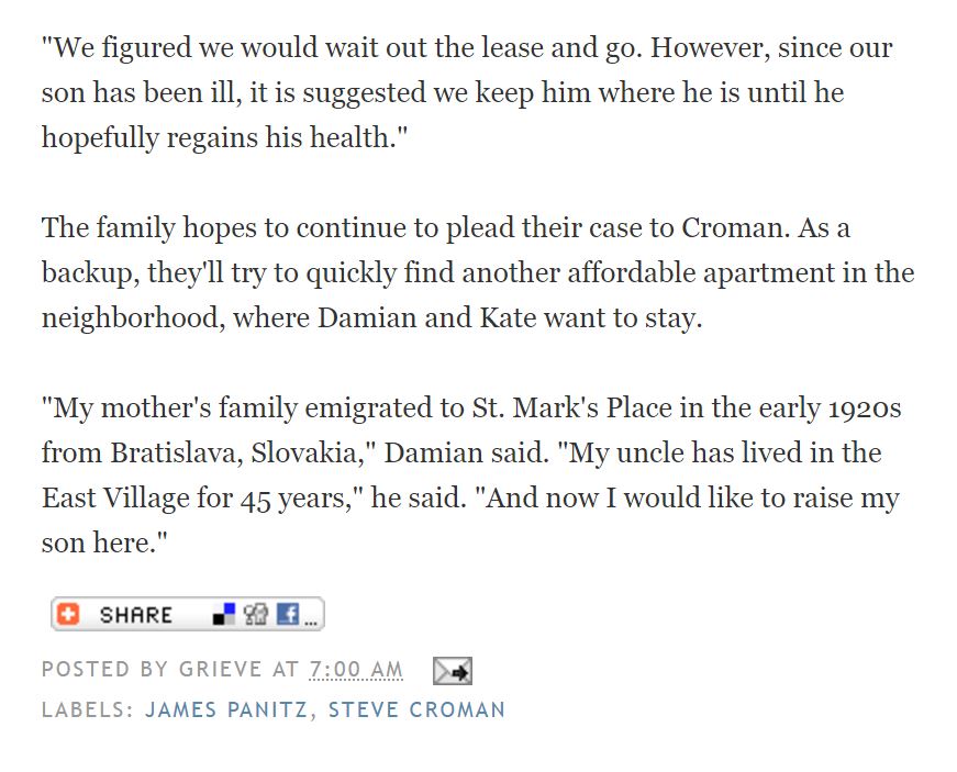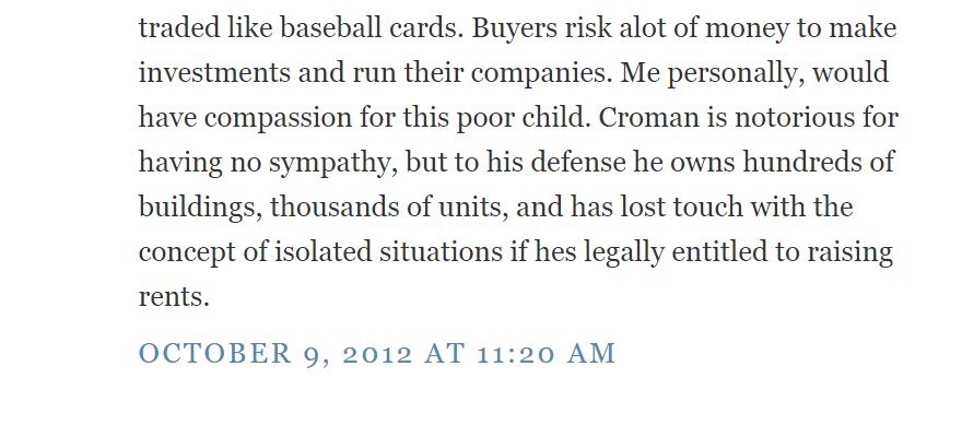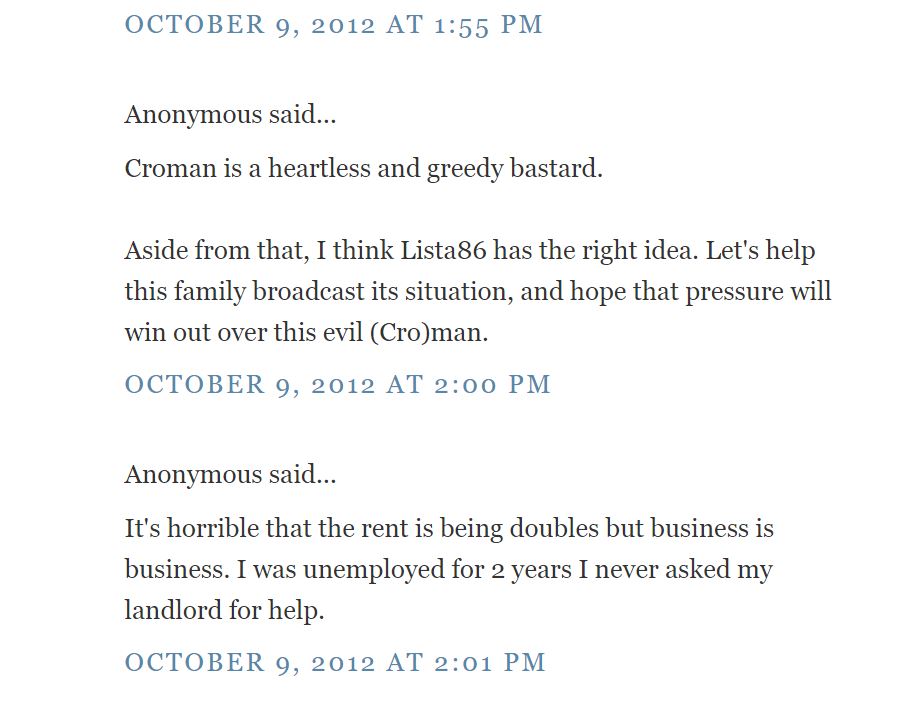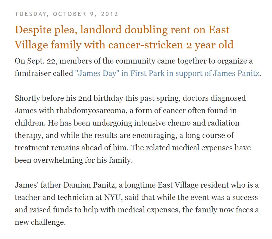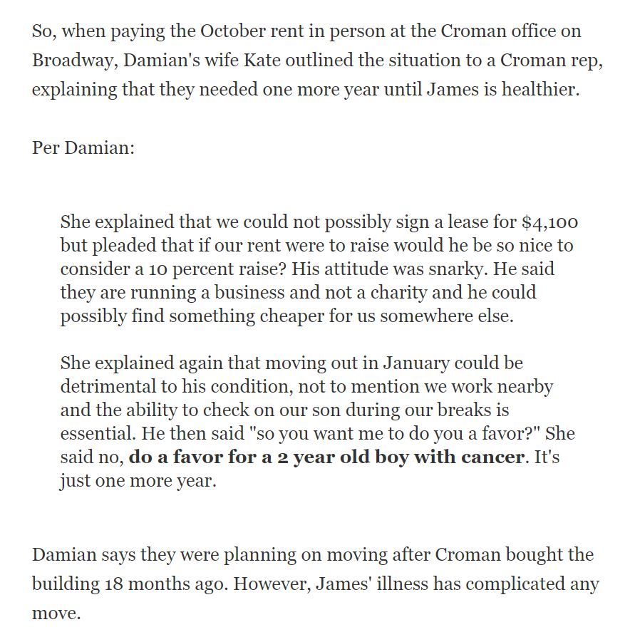You don’t have to be old to come into Steve Croman’s cross hairs. In 2012 a beautiful child, James Panitz, two years old and suffering with rhabdomyosarcoma cancer, was undergoing radiation and chemotherapy when Croman decided to almost double their rent from $2,100.00 to $4,100 a month in his East First St. building. His parents burdened with exorbitant hospital costs asked Croman if he could delay or forego the hefty rent increase during his treatments, but Croman never to let something like this interfere with the rent hike, refused. His rep said, “ We are running a business and not a charity.” Unable to pay both the medical bills and the rent increase, they were forced to move.